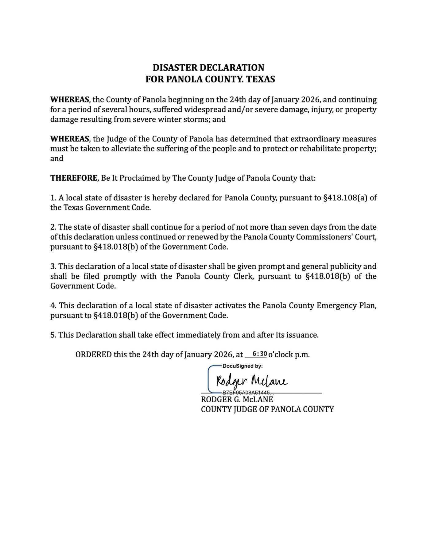 Citizens are encouraged to contact Emergency Services if they are aware of individuals or families in need of assistance. If you know of anyone without power or adequate heat, food, or essential supplies, or who may need transportation to the warming center, please notify the Panola County Sheriff’s Office at 903-693-0333 so assistance can be coordinated.